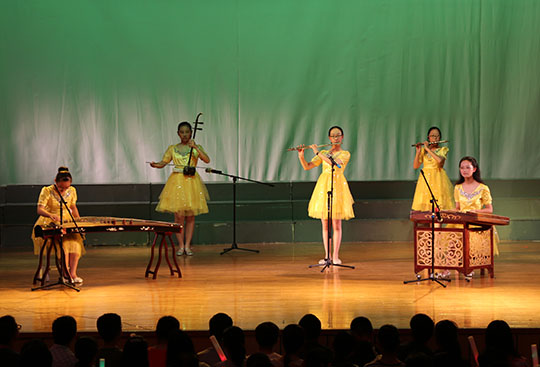在众人的热切期待中,在一曲清脆嘹亮的笛子独奏《我是一个兵》中,晚会拉开了帷幕,后面的节目精彩纷呈,引人入胜。有美妙绝伦的独唱、小合唱,有歌曲、舞蹈串烧,有令人捧腹的小品相声,有余音绕梁的二胡及电声乐队表演,有姿态翩跹的独舞,也有动感强劲的拉丁舞……一次次掀起晚会现场的热潮,高一(5)班的《青春演播室》幽默风趣的把军训生活的情况真实得呈现出来,获得了雷动的掌声;平时严肃的军训教官可不含糊,他们的军事技能表演擒拿格斗,气势不凡,动人耳目,引来全场的热烈鼓掌和欢呼,而他们表演的小合唱《追梦赤子》,则引来高一16班学生登台献花,高呼男神;马婧艺老师和高一(6)班学生表演的街舞,几乎让全场沸腾,特别是全体高一班主任表演的教师小合唱《真心英雄》,更是掀起了晚会小高潮,学生还自发上台将手中的荧光棒敬献给自己可亲可爱的老师,老师们憔悴的脸上洋溢着幸福的微笑。观看的学生热情高涨,台上台下遥相呼应,荧光棒尽情挥舞,彩灯闪烁,尽情演绎青春的风采。最后高一14班的全体学生登台表演诗朗诵《军训礼赞》,尽情抒写了对学校、教官、老师的感恩之情以及对自己的激励之意。